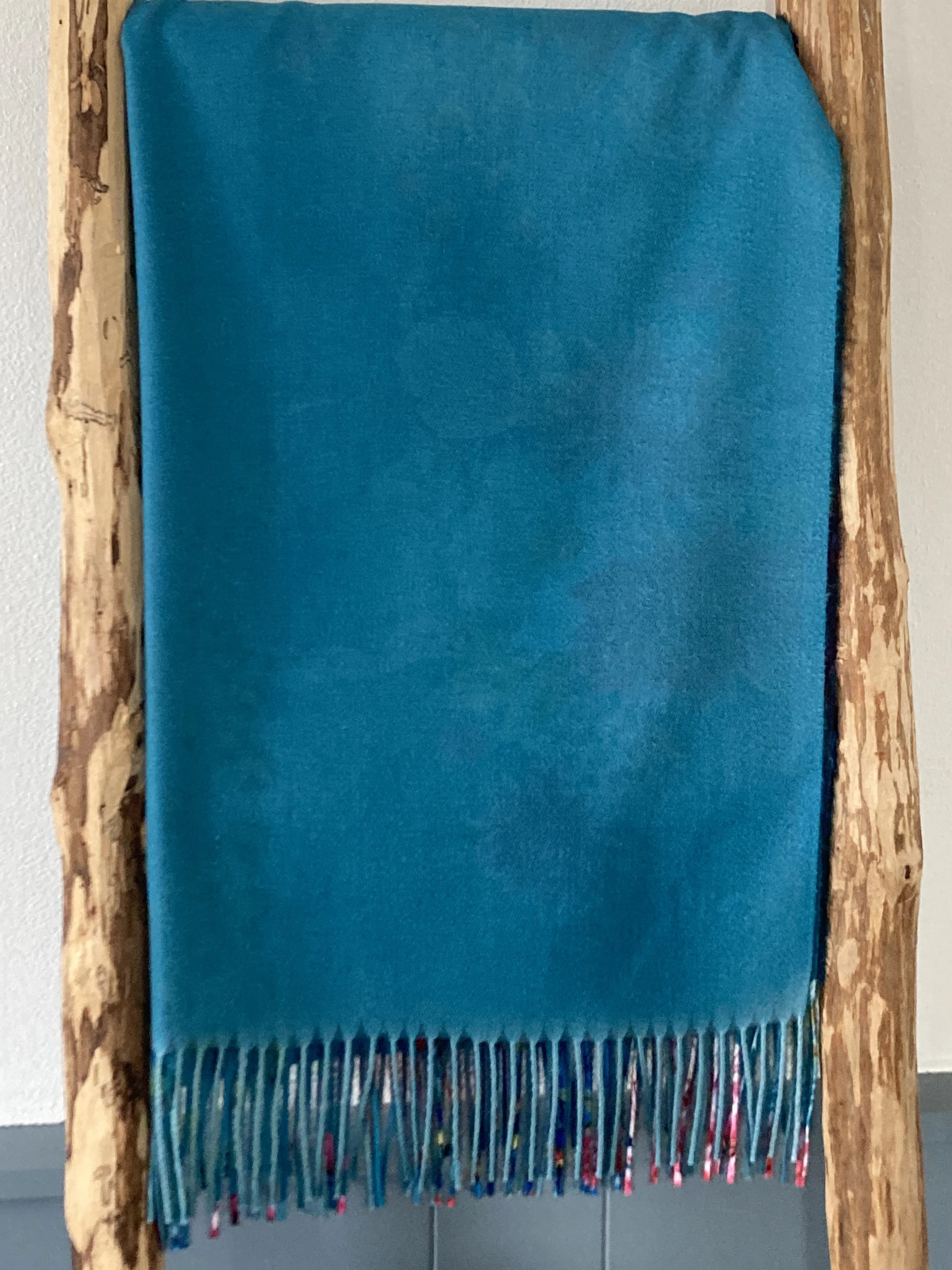 De sjaal is afgewerkt met sierlijke franjes.