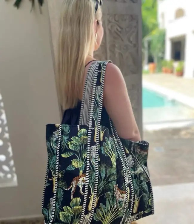 Strandtas Jungle Zwart, niet alleen geschikt voor naar het strand maar multifunctioneel ! Boodschapjes, dagje uit, yoga, sportschool, welness. En door de brede hengels comfortabel te dragen.